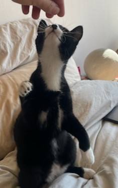 Alya est arrivée dans mon appartement apeurée, elle cherchait à tout prix à se cacher sous le lit, derrière le meuble ou le fauteuil, dans des endroits sombres qui lui rappellent probablement ses cachettes lorsqu’elle vivait dehors. J’ai quand même pu l’attraper pour l’enfermer dans une pièce pour l’habituer à ce nouveau lieu. Elle est venue me réclamer des câlins instantanément. J’ai compris qu’elle était stressée mais que c’était une vraie adepte des caresses. Le lendemain au soir, elle était montée sur mon lit par elle-même pour demander encore plus de câlins. Même si je la voyais rarement pendant la journée, elle faisait des apparitions régulières le soir pour se faire cajoler.