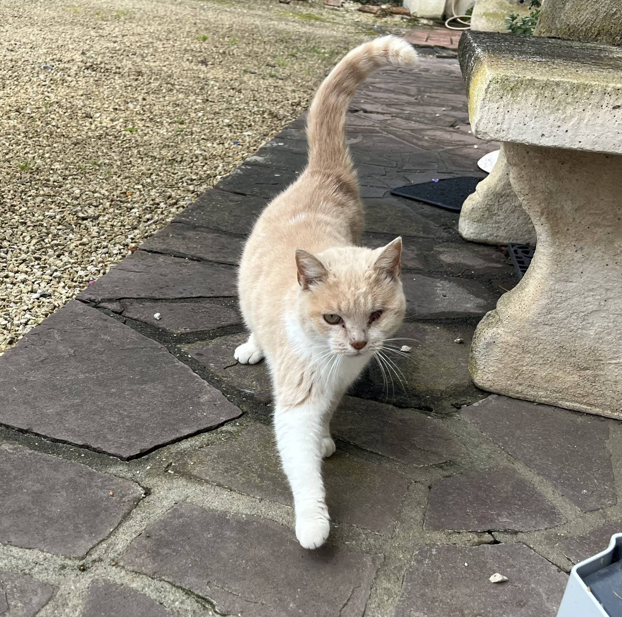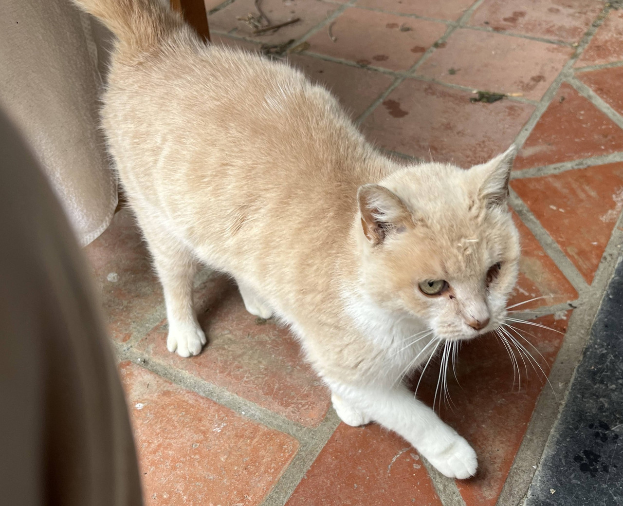 Doucette est une chatte très douce et calme. Très gentille et câline. On lui donne le nom de Doucette. Elle a l’oeil droit atrophié c’est sûrement de naissance.